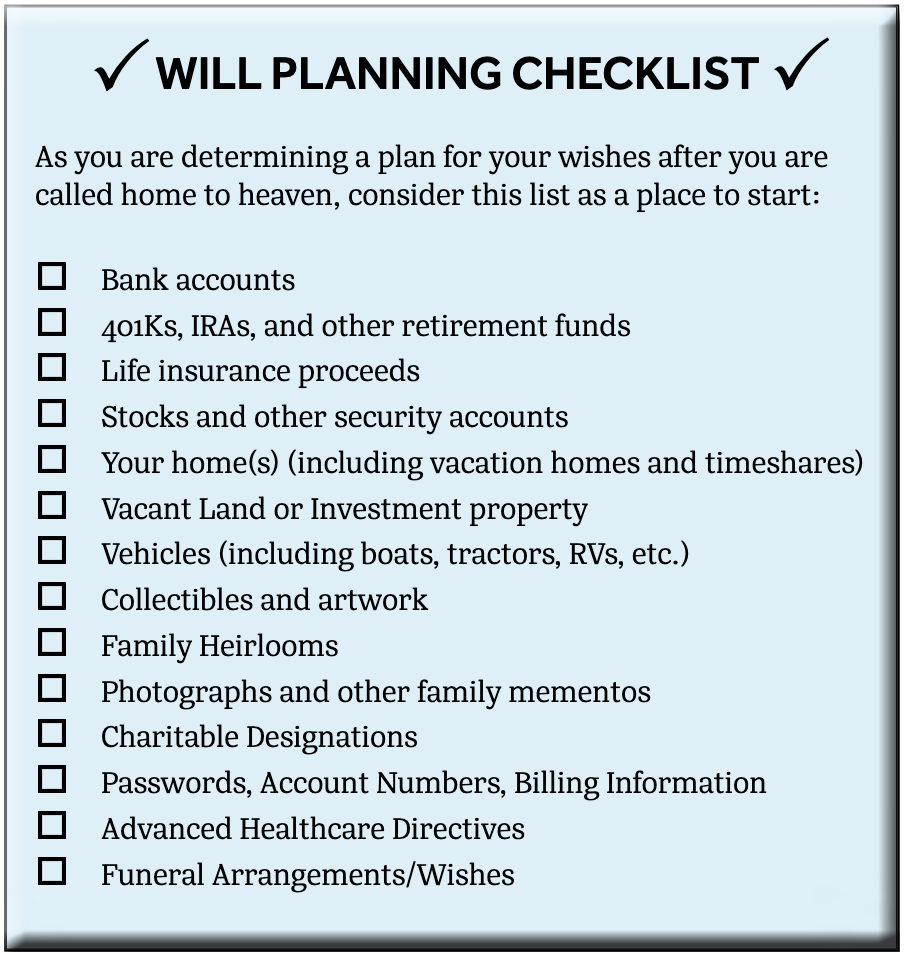 As you begin to plan or review your current will, you should examine all of your assets and write down what they are (and where they are at). You should also check and update your beneficiary designations at least every decade and after all major life events, such as marriage or divorce, moving to a different state, new grandchildren, etc. These beneficiary designations would be found in your 401K accounts, life insurance plans, etc. We can recount several cases where a former spouse was still the listed beneficiary in their retirement plan, and how surprised their current spouse would have been if something happened to them before they reviewed their plans!